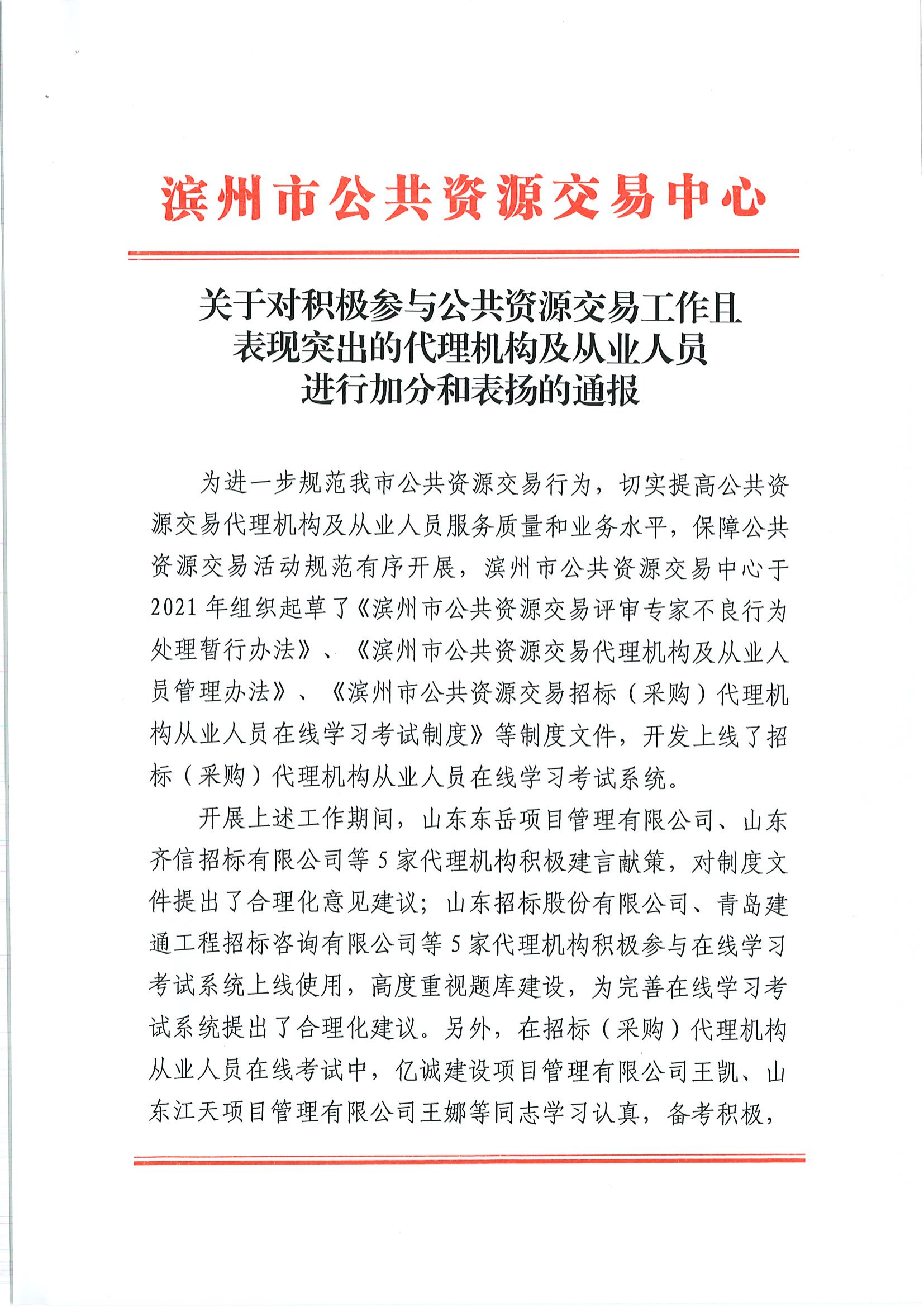 濱州市公共資源交易中心于2021年組織起草了多項(xiàng)制度文件,齊信濱州分公司積極建言獻(xiàn)策,對文件提出了合理化意見建議,為完善制度建設(shè)做出了突出貢獻(xiàn)。經(jīng)濱州市公共資源交易中心研究決定,對齊信予以5分加分獎(jiǎng)勵(lì),記入濱州公共資源交易誠信評價(jià)系統(tǒng)并通報(bào)表揚(yáng)。